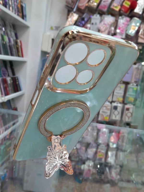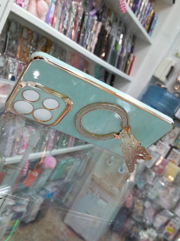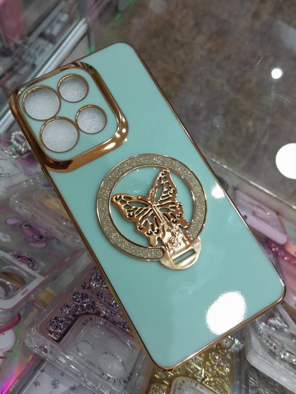 ¡Dale un toque elegante y único a tu celular! 😍 Esta funda en color verde menta pastel con bordes dorados te ofrece un diseño sofisticado, ideal para destacar tu estilo. Incluye un soporte giratorio en forma de mariposa con incrustaciones brillantes que sirve como anillo para sujetar o como base para tu celular.